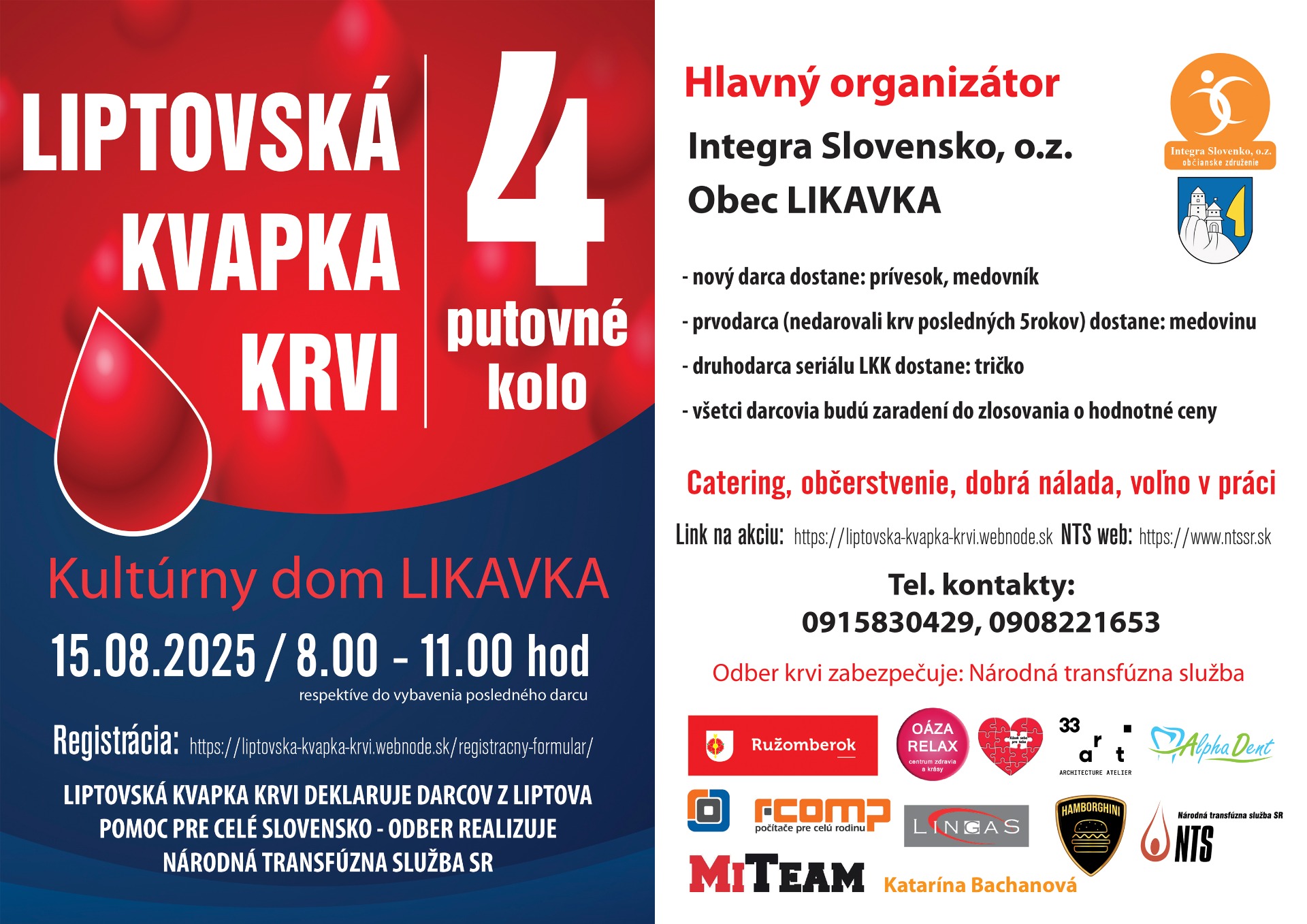 Ďalšie pokračovanie v poradí štvrtej humanitárnej a dobročinnej akcie s názvom Liptovská kvapka krvi sa uskutočnilo dňa 15.08.2025 v Kultúrnom dome v Likavke.
